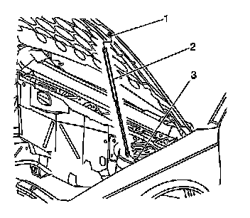7. Remove the upper hood assist rods from the assist rod ball studs (1) if removing the driver side wiper arm.