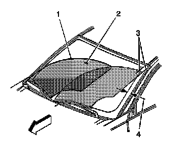 3. Position the driver side wiper arm so that the wiper blade tip (4) aligns with the orange line on the lower center of the windshield.