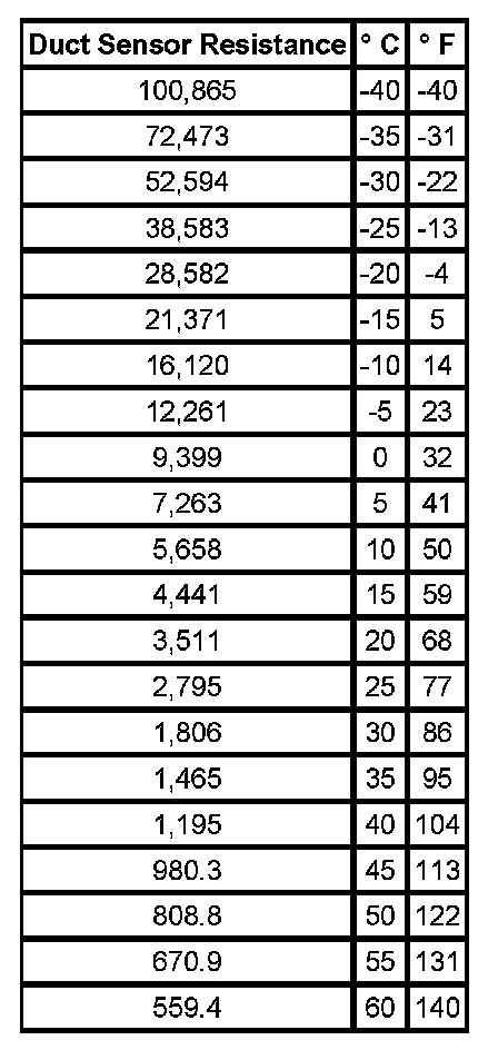 Sensor Resistance Table (Air Temperature Duct Sensor)