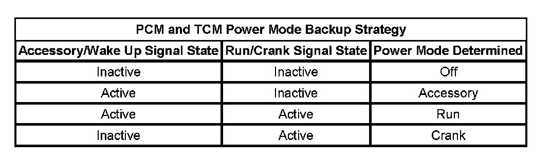 The PCM and TCM remain in the last known power mode state until it can determine its backup system power mode based on their discrete Accessory/Wake up and Run/Crank signal inputs.