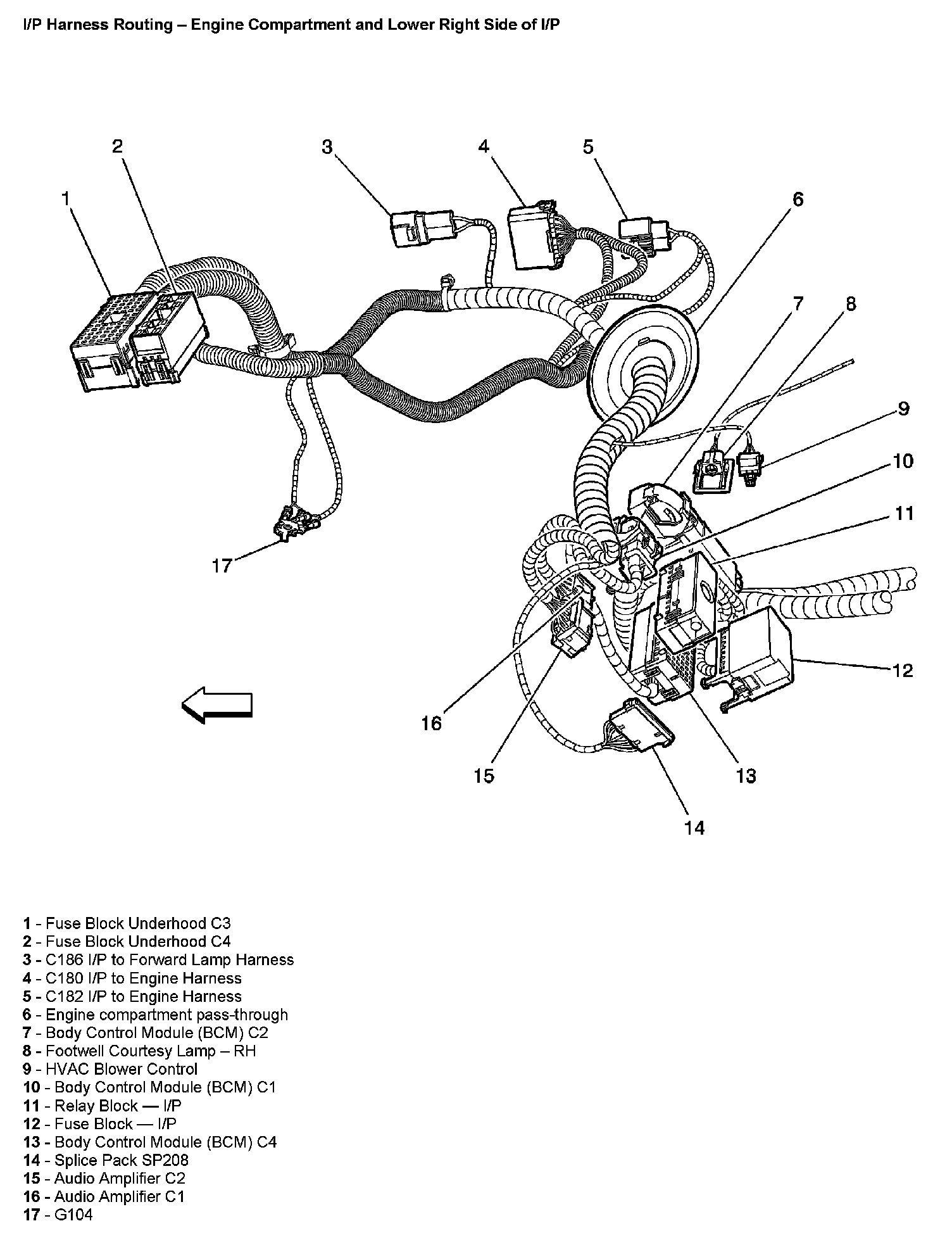 I/P Harness Routing - Engine Compartment and Lower Right Side of I/P: