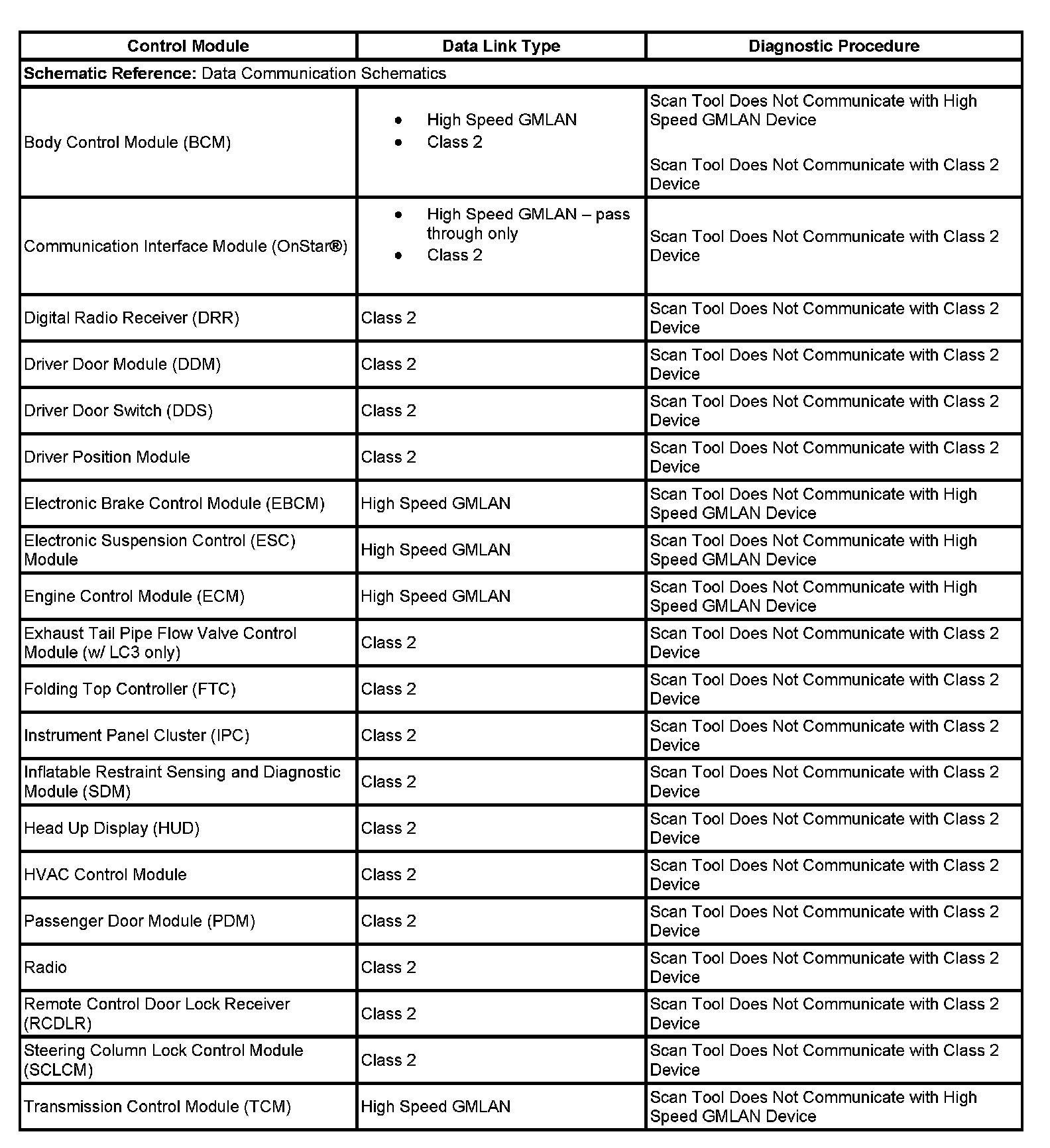 This table identifies which serial data link that a particular module uses for in-vehicle data transmission. Some modules may use more than one data link to communicate. Some modules may have multiple communication circuits passing through them without actively communicating on that data link. This table is used to assist in correcting a communication malfunction. The BCM emulates some devices that are on high speed GMLAN serial data circuit to the modules on class 2 serial data circuit. The BCM transmits multiple Node Alive messages using source IDs that correspond to each of those high speed GMLAN nodes. This is in addition to the BCM behaving itself as a real node. For the description and operation of these serial data communication circuits refer to Data Link Communications Description and Operation.