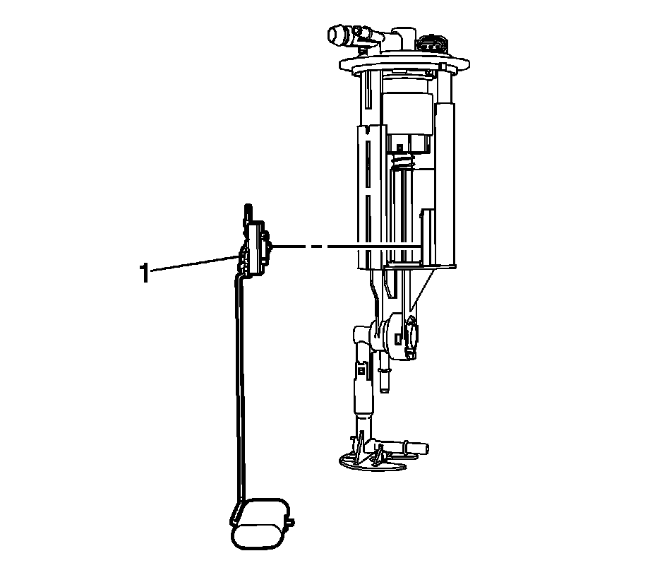 2. Install the fuel level sensor (1) to the fuel tank module by sliding it down until the lock tab clicks.