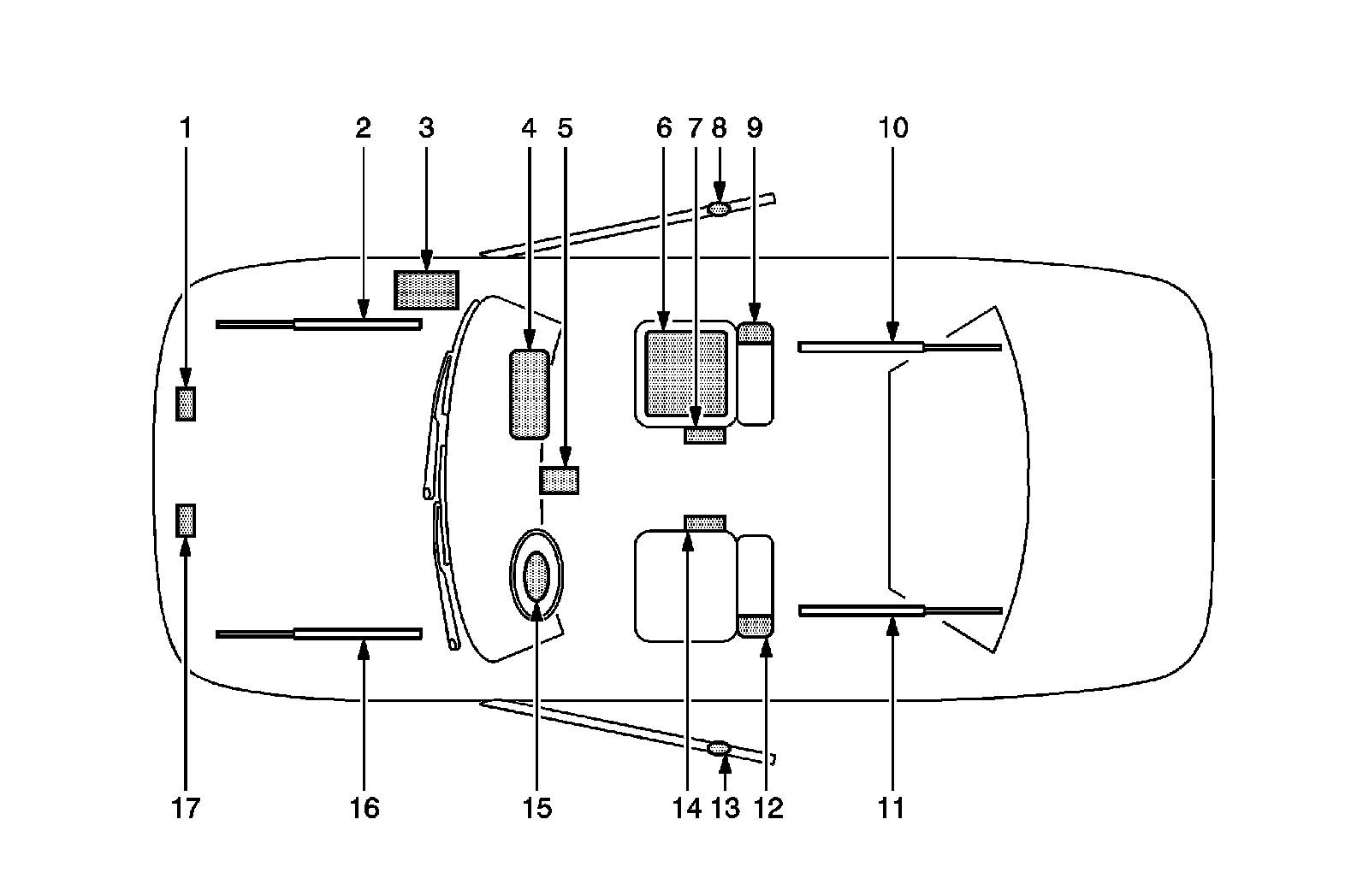 17 - Left Front End Sensor-Located on the front of the vehicle in the engine compartment