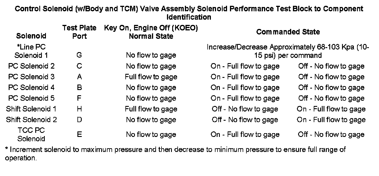 The purpose of this procedure is to test the operation of the control solenoid (w/body and TCM) valve assembly for a stuck open or stuck closed solenoid. The DT-47825 bolts to the mounting surface of the control solenoid (w/body and TCM) valve assembly. Compressed air is attached to the test block, through the control solenoid (w/body and TCM) valve assembly solenoid passage and back to a pressure gage on the test plate, sent through the control solenoid (w/body and TCM) valve assembly solenoid, and back to the test plate pressure port.