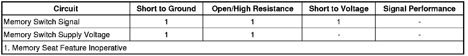 Battery positive voltage is supplied to the memory switch from the driver door module (DDM). When a memory switch is pressed, battery voltage is applied through the switch contacts, a series of resistors and thorough the memory switch signal circuit to the DDM. The door module then sends a message via the GMLAN serial data line to the memory seat module (MSM) indicating the memory recall request. The MSM then commands the appropriate seat motors to move to the pre-recorded seat positions stored in memory in response to the switch input.