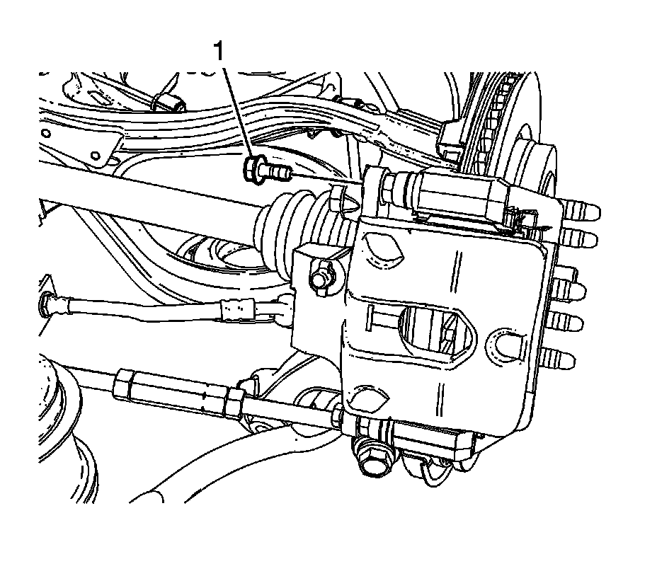 Notice: Support the brake caliper with heavy mechanic wire, or equivalent, whenever it is separated from its mount and the hydraulic flexible brake hose is still connected. Failure to support the caliper in this manner will cause the flexible brake hose to bear the weight of the caliper, which may cause damage to the brake hose and in turn may cause a brake fluid leak.