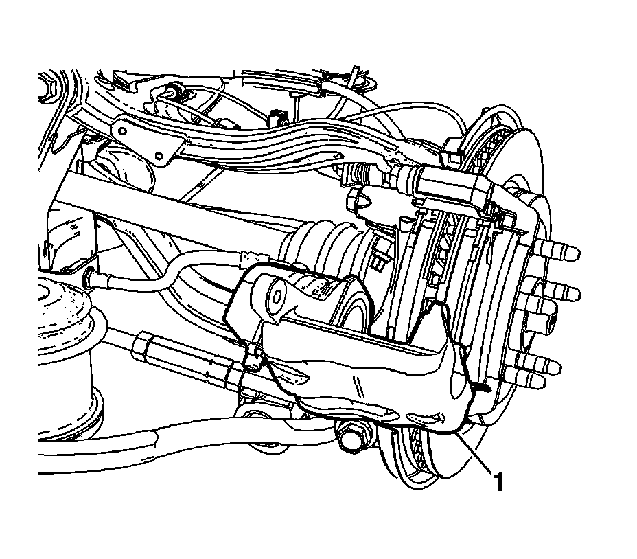 9. Pivot the brake caliper (1) forward and support with heavy mechanics wire or equivalent.