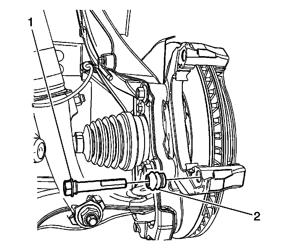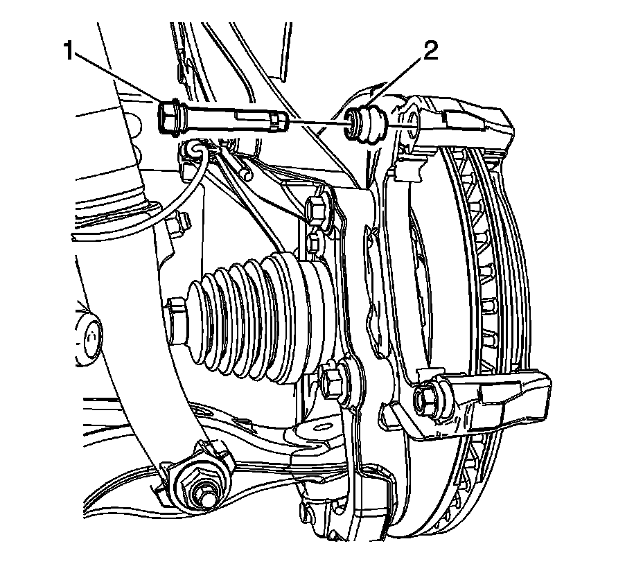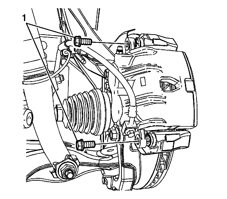 3. Using a backup wrench on the brake caliper guide pin, remove the brake caliper guide pin bolts (1).