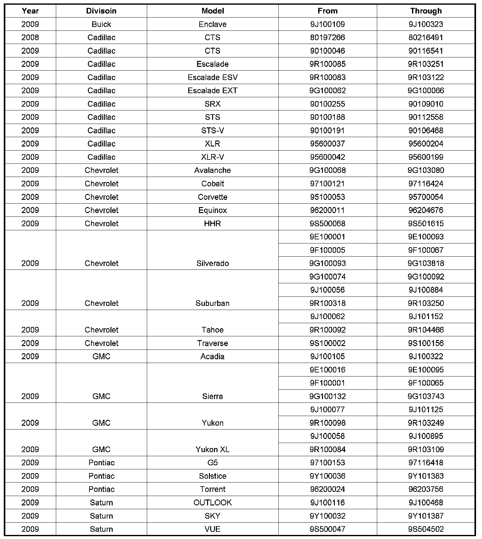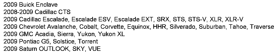 Involved are certain 2009 model year Buick Enclave; 2008-2009 model year Cadillac CTS; 2009 Cadillac Escalade, Escalade ESV, Escalade EXT, SRX, STS, STS-V, XLR, XLR-V; Chevrolet Avalanche, Cobalt, Corvette, Equinox, HHR, Silverado, Suburban, Tahoe, Traverse; GMC Acadia, Sierra, Yukon, Yukon XL; Pontiac G5, Solstice, Torrent; and Saturn OUTLOOK, SKY, and VUE vehicles built within the VIN breakpoints above.