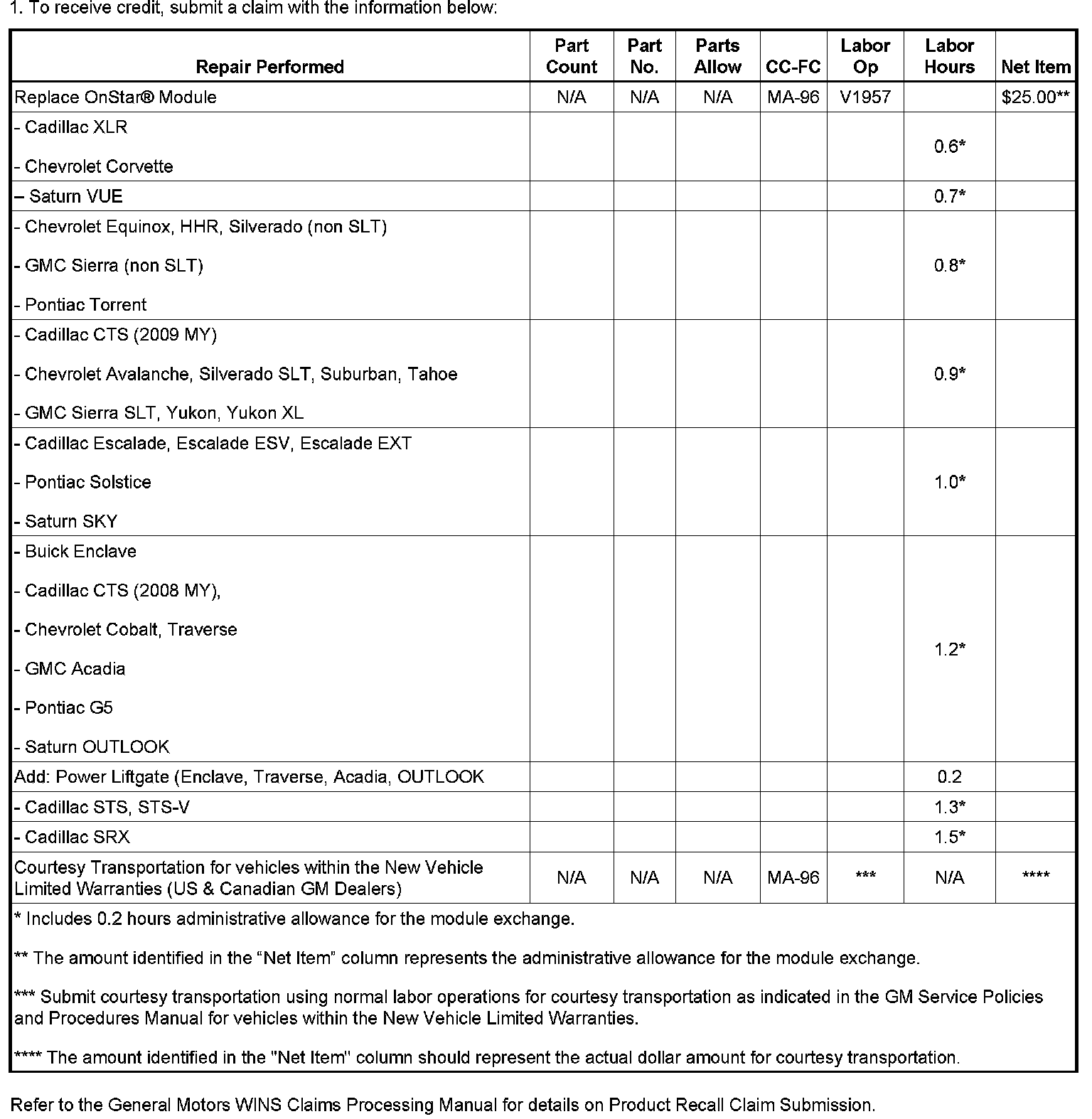U.S.: OnStar(R) modules required for this recall are to be obtained by contacting Autocraft Electronics via the web at www.autocraft.com, and selecting the catalog item that contains bulletin number 08259 (or PIC 4916). Dealer must provide the VIN, R.O. number and the current vehicle mileage.