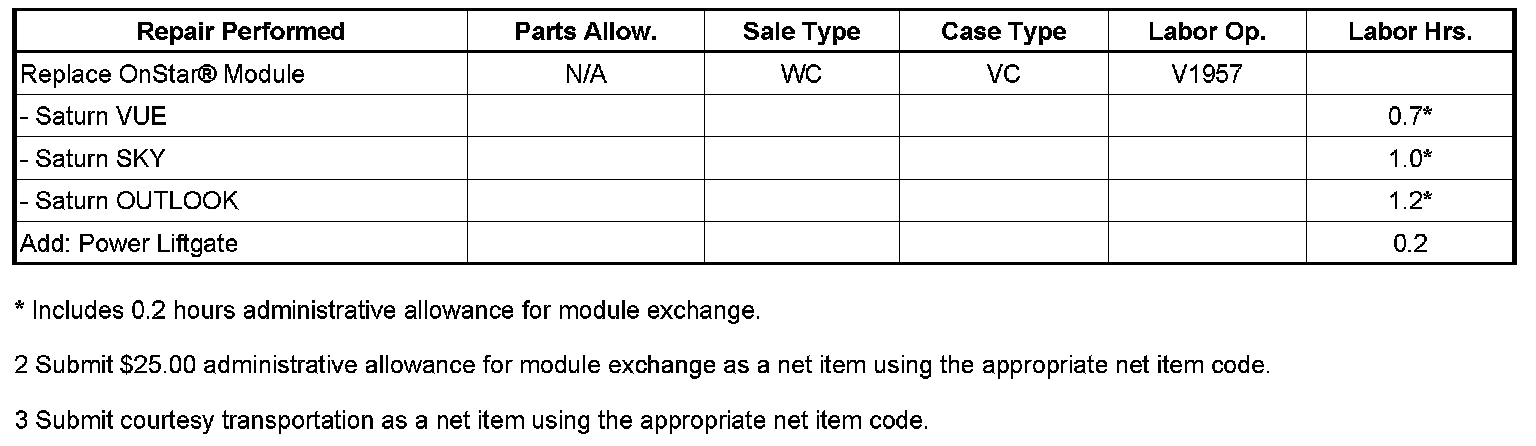 Canada: OnStar(R) modules required for this recall are to be obtained by contacting MASS Electronics at 1-877-410-6277. Dealer must provide the VIN, R.O. number and the current vehicle mileage. DO NOT ORDER ONSTAR MODULES FROM GENERAL MOTORS SERVICE AND PARTS OPERATIONS (GMSPO), SATURN SERVICE PARTS OPERATION (SSPO), OR THE TECHNICAL ASSISTANCE CENTER (TAC).