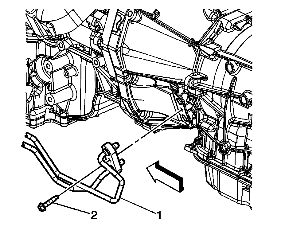 9. Remove the transmission fluid cooler pipes (1) from the transmission, and position aside. Refer to Transmission Fluid Cooler Pipe Replacement - Rear (Service and Repair) .