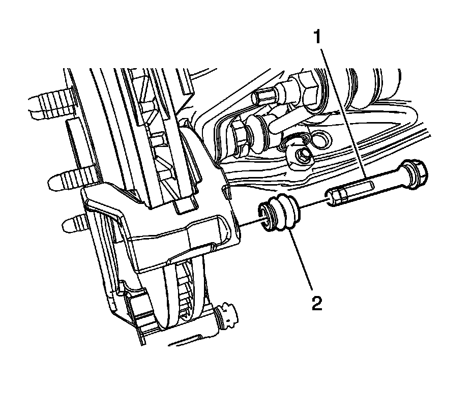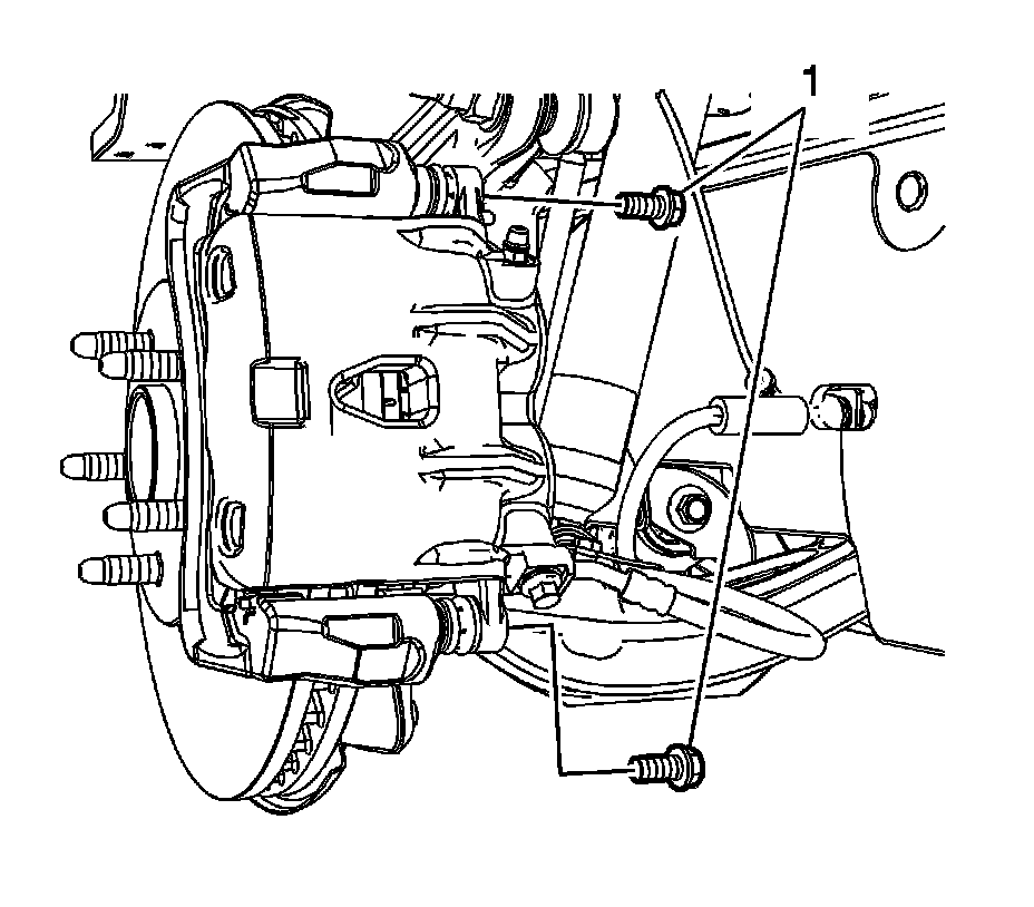 3. Using a backup wrench on the brake caliper guide pin, remove the brake caliper guide pin bolts (1).