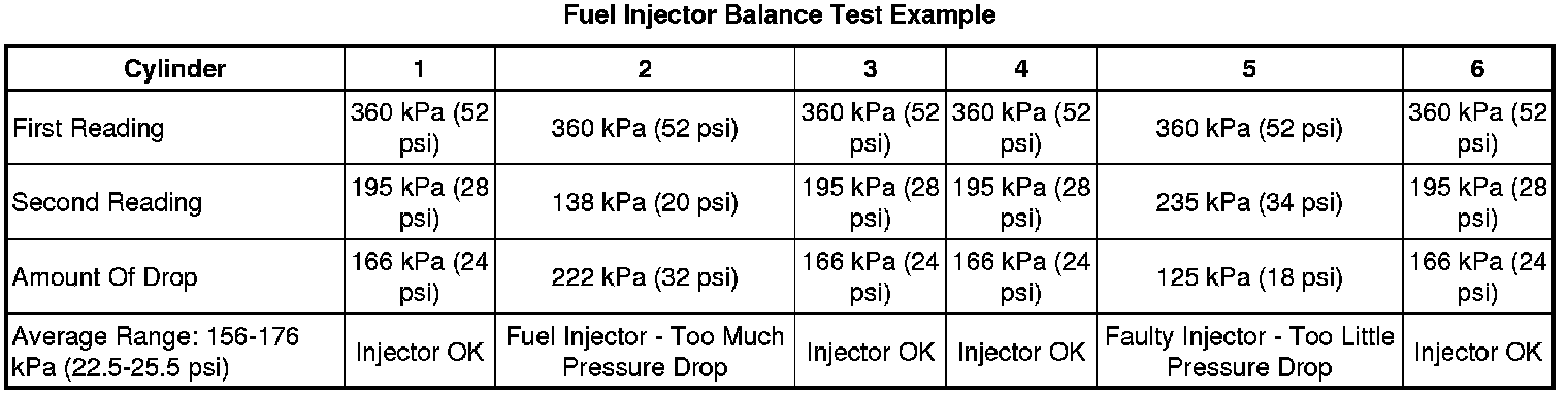 • If the difference between any individual pressure drop and the average pressure drop is more than 20 kPa (3 psi), replace the fuel injector.