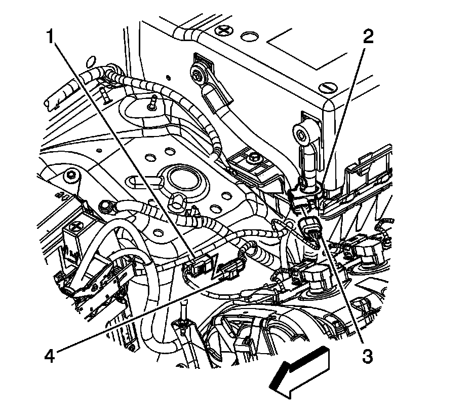 2. Disconnect the instrument panel (I/P) wiring harness electrical connector (1) from the negative battery cable electrical connector (4).