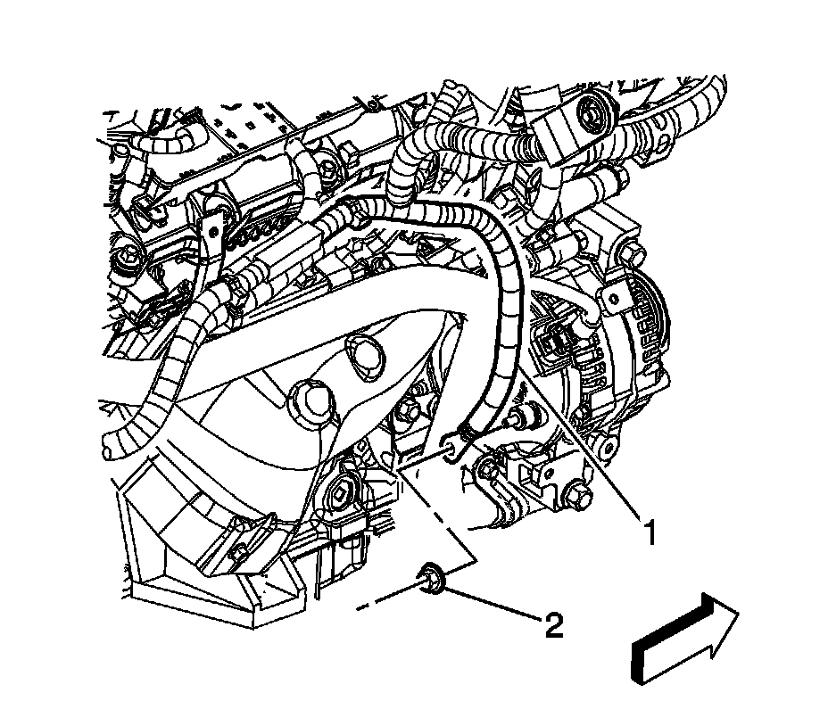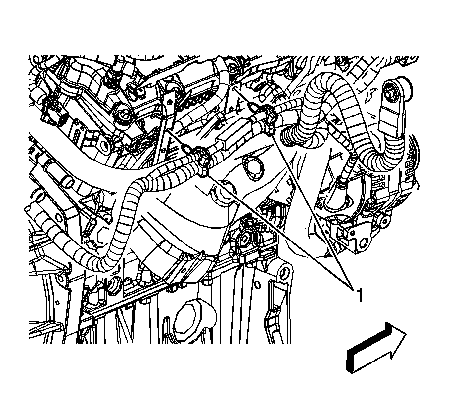 14. Remove the positive battery cable clips (1) from the radiator outlet pipe brackets.