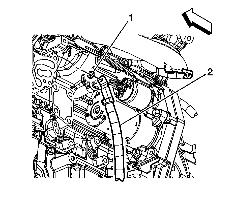 12. Remove the starter terminal nut (1) and remove the battery positive cable (2) from the starter.