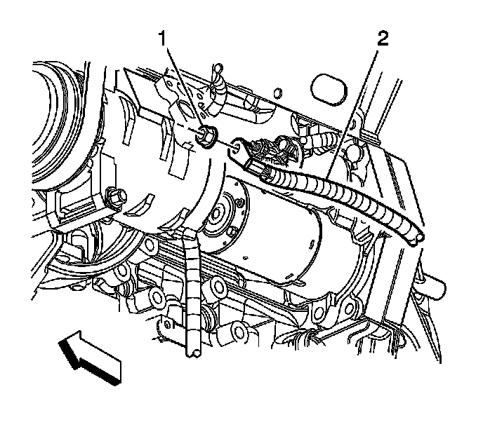4. Remove the starter terminal nut (1) and the battery positive cable (2) from the starter.