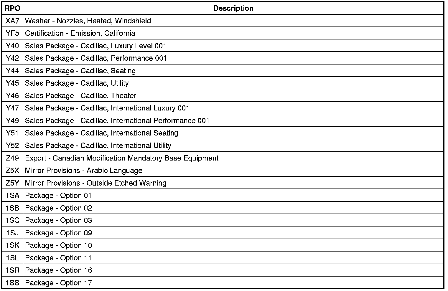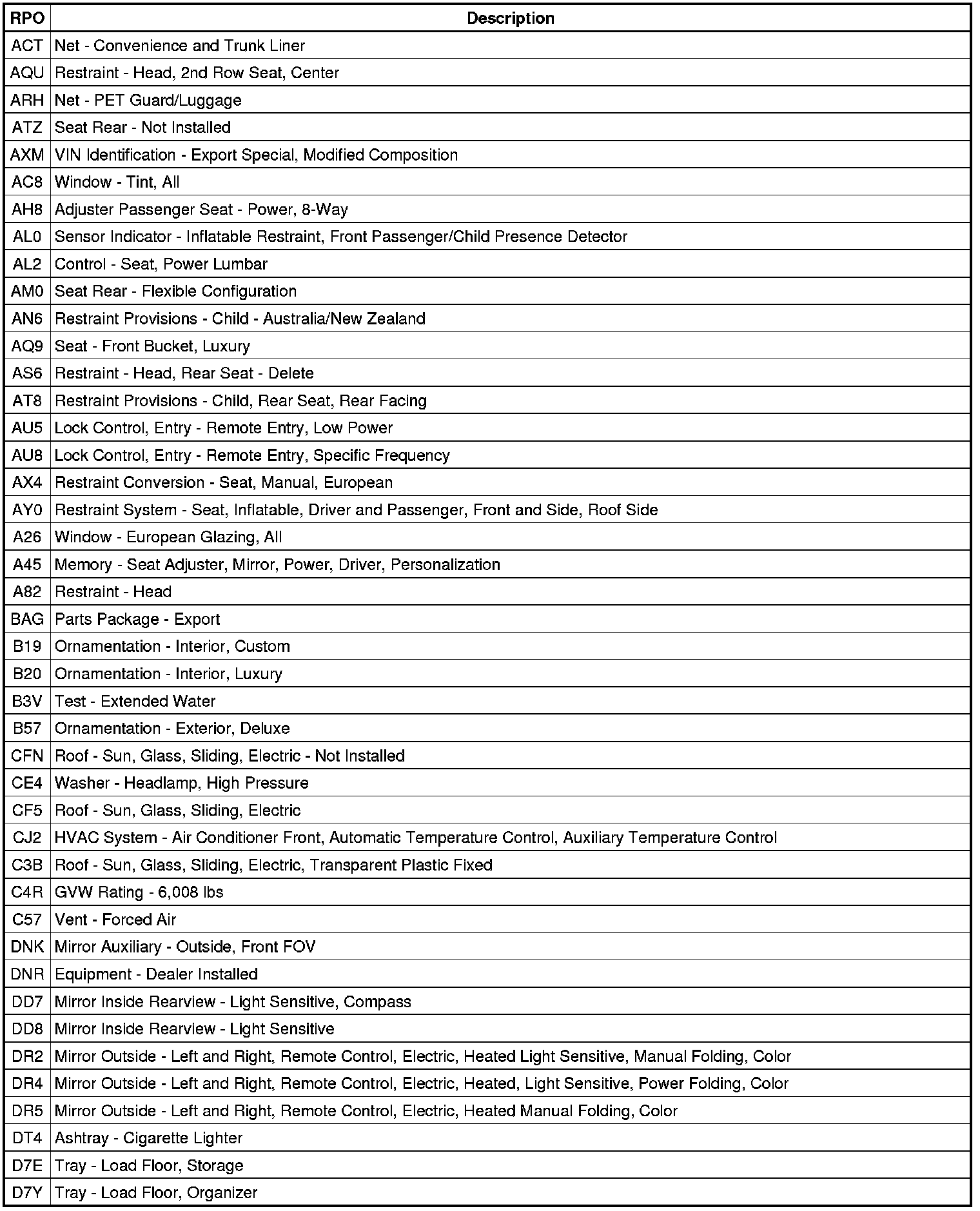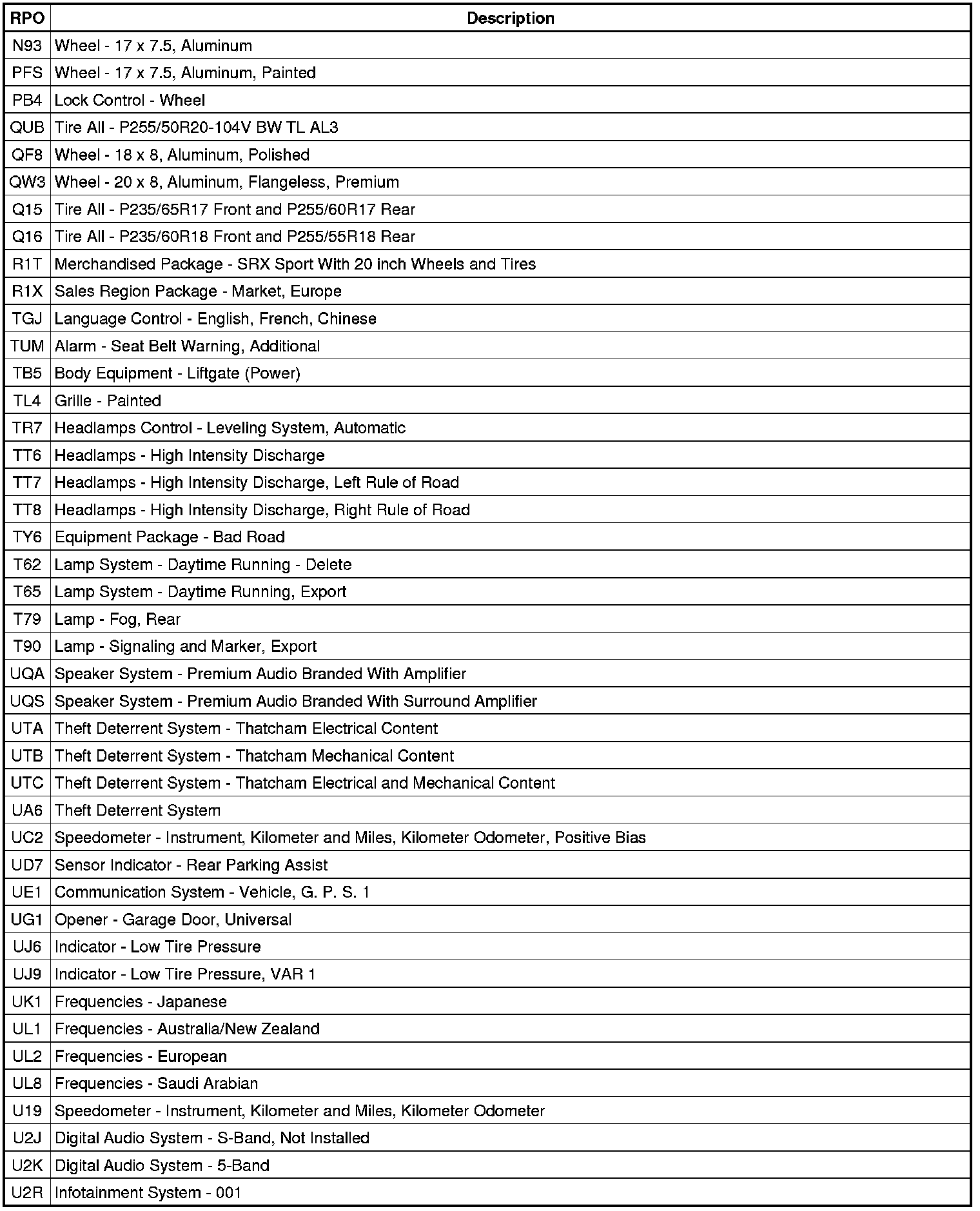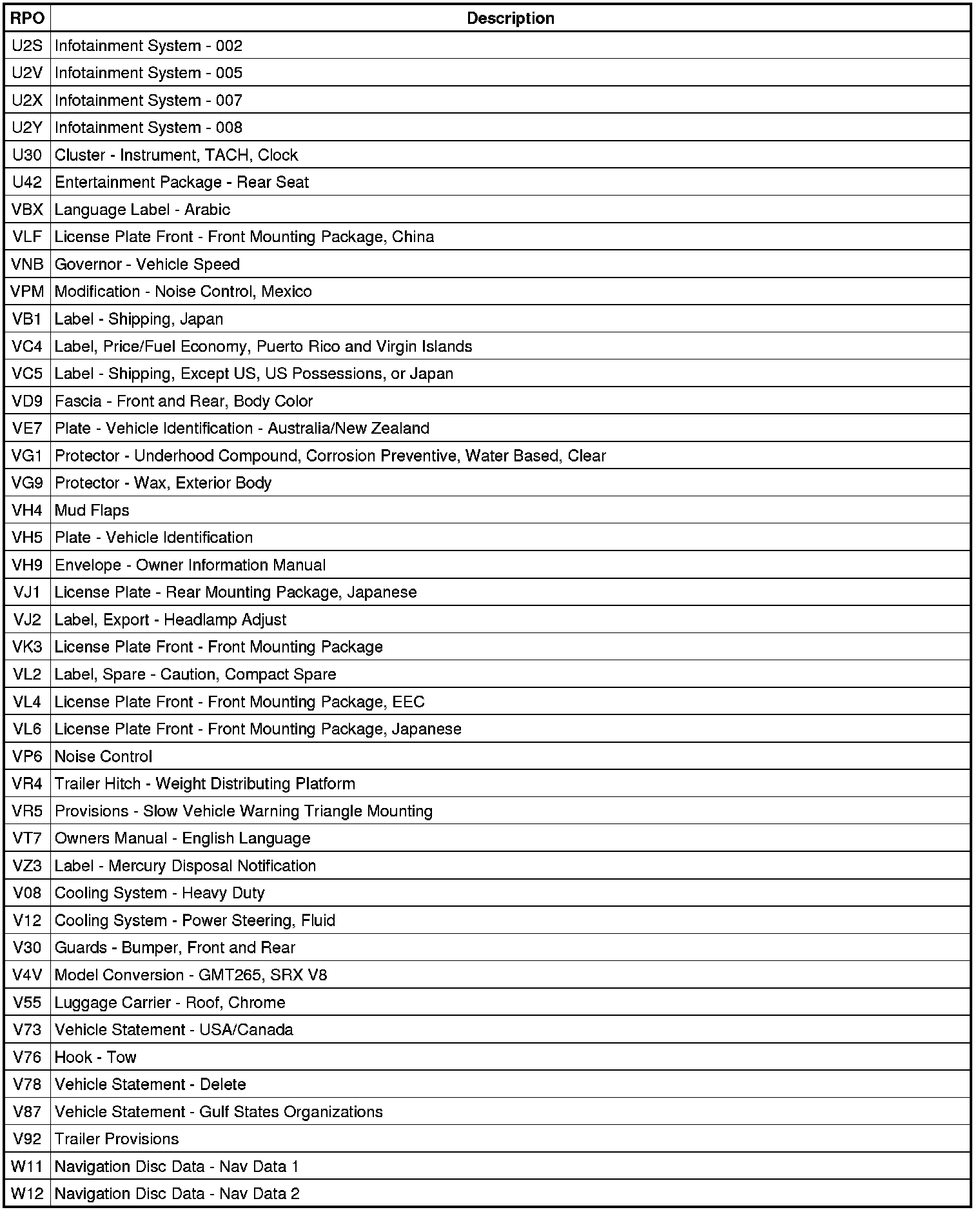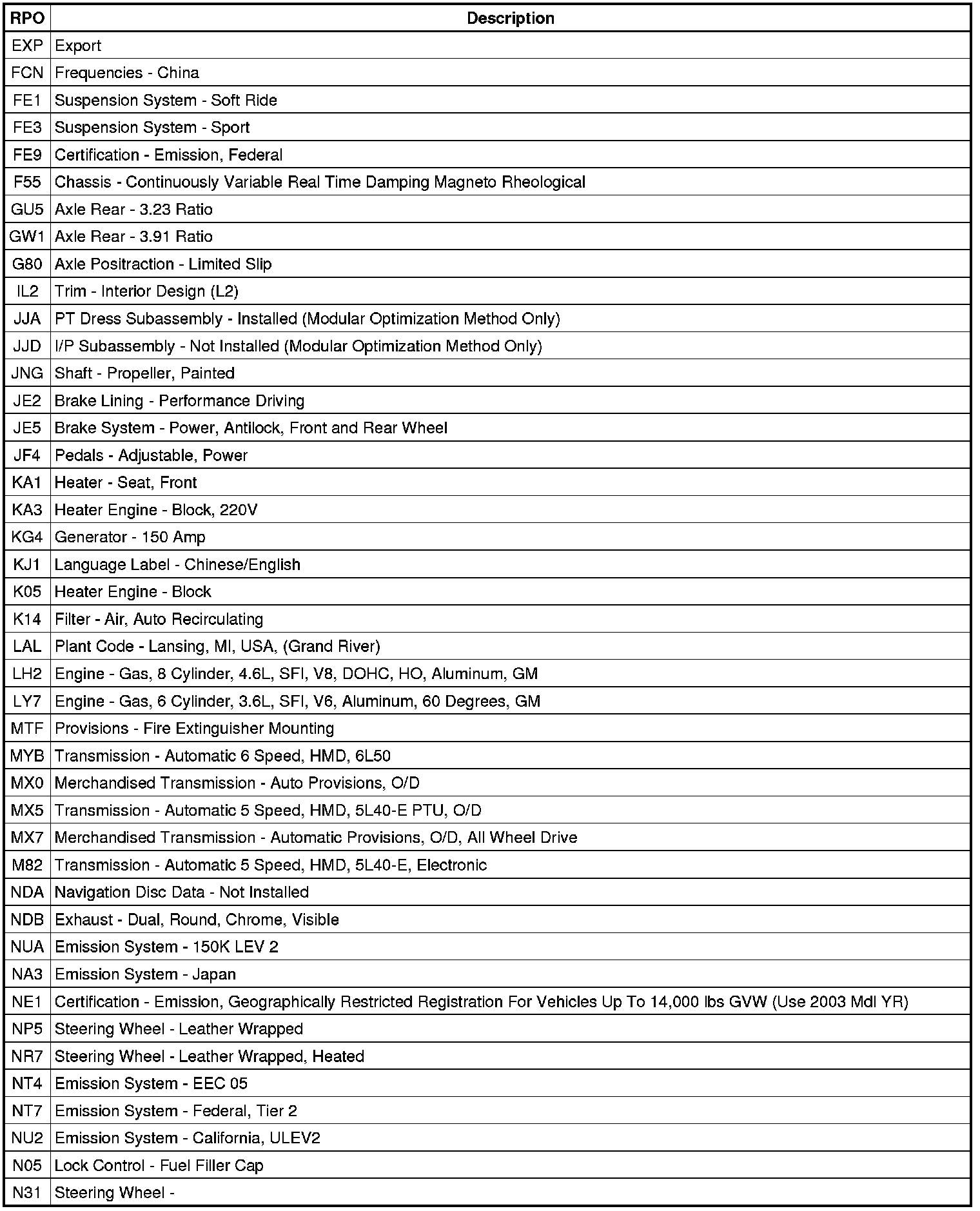 The following table provides the description of the Regular Production Option (RPO) codes that are available on the vehicle. The vehicle's RPO list is printed on the Service Parts Identification Label.