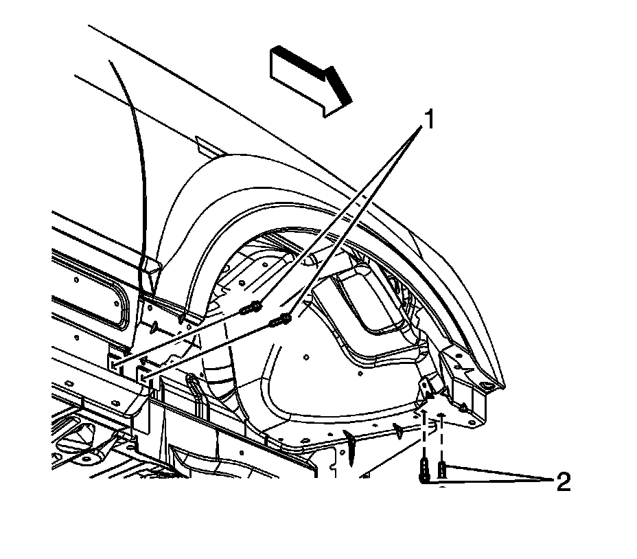 9. Remove the bolts (2) securing the lower rear portion of the front fender to the vehicle.