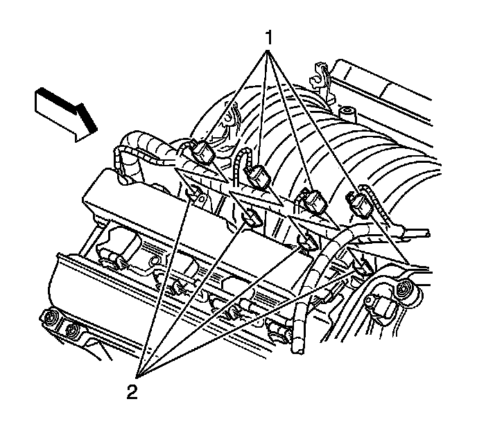8. Disconnect the right side fuel injector electrical connectors (1) from the fuel injectors (2).