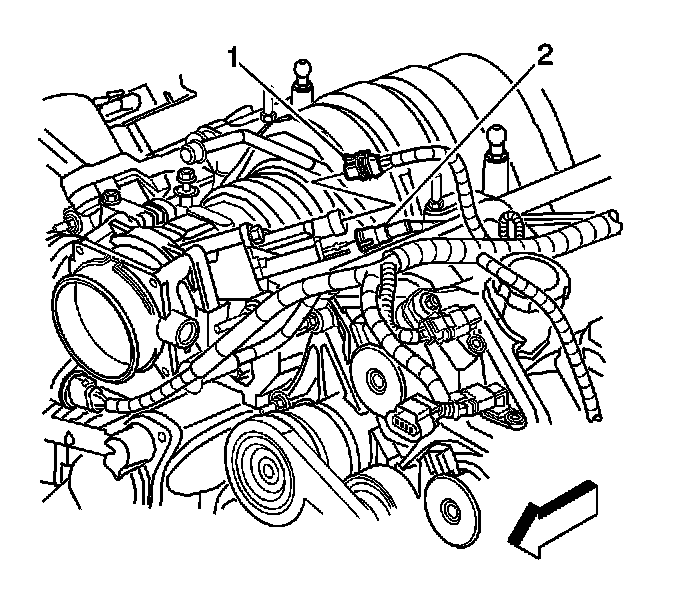 9. Disconnect the evaporative emission (EVAP) purge valve line (2) and electrical connector (1).