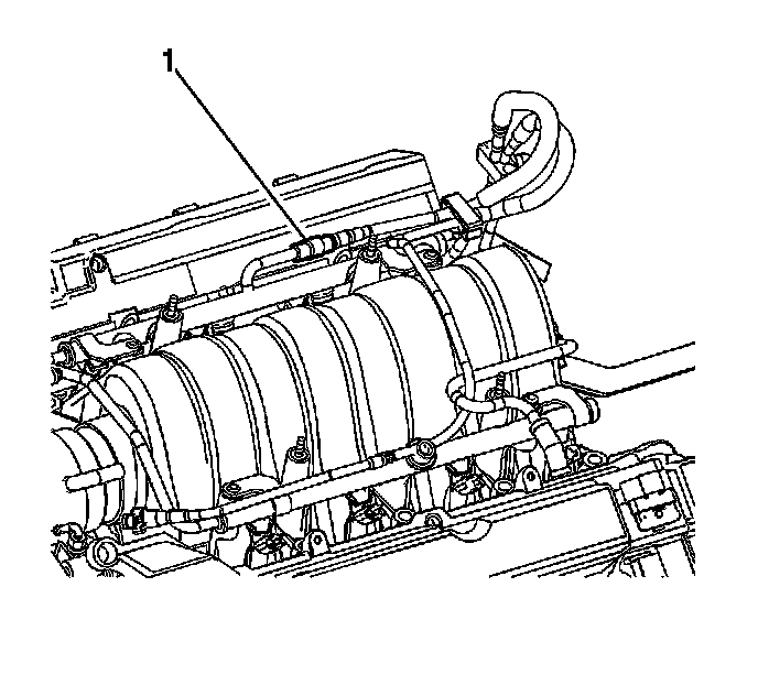 12. Disconnect the fuel line from the fuel rail (1). Refer to Metal Collar Quick Connect Fitting Service (Metal Collar Quick Connect Fitting Service) or Plastic Collar Quick Connect Fitting Service (Plastic Collar Quick Connect Fitting Service) .