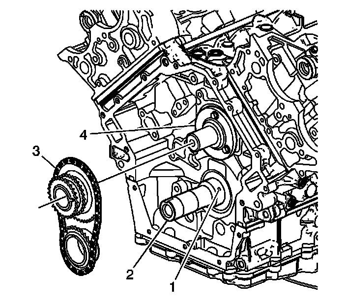 4. Timing the primary timing gears ensures that the #1 cylinder piston, bank 1 right front cylinder, is at top dead center (TDC) beginning its power stroke event. If this condition can not be accomplished while rotating the crankshaft (2), remove the primary gears and chain (3) and realign the primary timing marks. Refer to Primary Camshaft Drive Chain Removal (Overhaul) and Primary Camshaft Drive Chain Installation (Overhaul) .