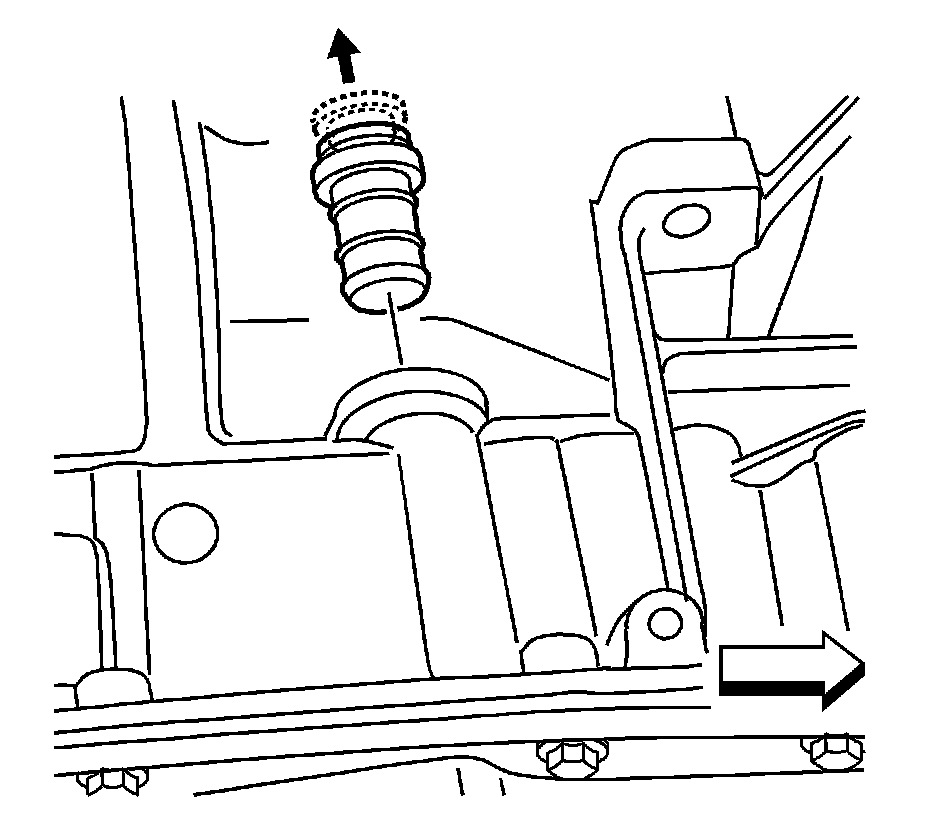 Notice: Before removing the transmission fluid fill tube plug assembly, thoroughly clean around the plug to prevent dirt or contaminants from entering the transmission during plug removal. Use compressed air to dislodge any caked dirt that may be stuck on and around the plug area. Use a mirror to confirm the area is free of dirt before removing the plug. Failure to clean around the plug may result in transmission contamination.