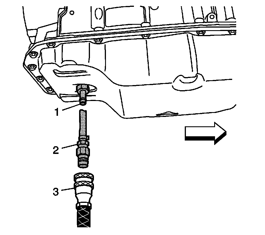 Perform this procedure for vehicles with transmissions that are not equipped with a fill tube and dipstick. Based on accessibility, transmission fluid may be added through the fluid fill tube plug assembly (1) hole or through the oil level check plug (2) hole in the bottom of the transmission fluid pan.