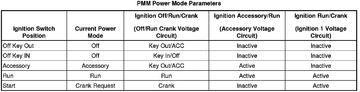 2. With a scan tool, verify the Power Mode data display parameters match the chart below. The PMM Power Mode Parameters table below illustrates the correct state of these input parameters (circuits) in correspondence to the ignition switch position. The circuits which the individual parameters are related to are in parentheses.