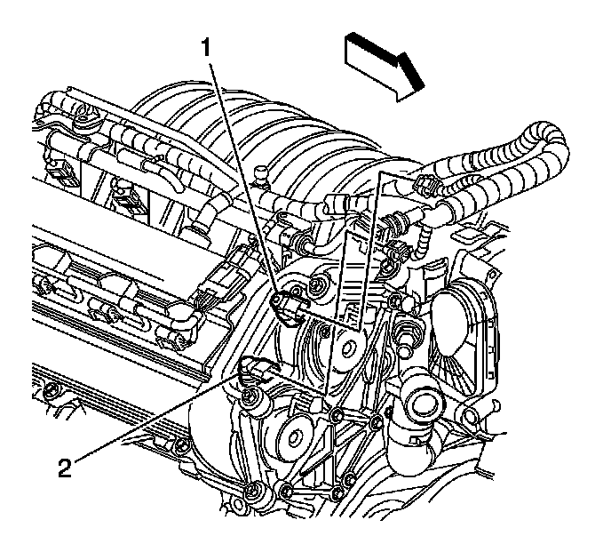 2. Install the right bank intake camshaft position sensor (2) and retaining bolt.