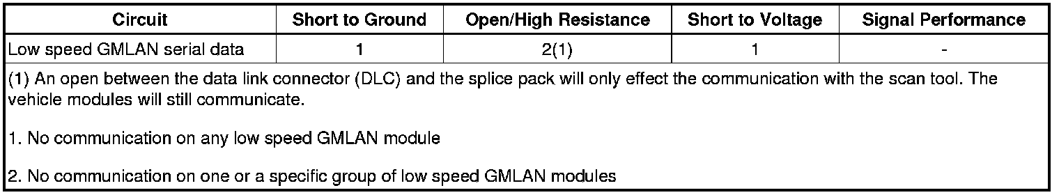 * An open in the low speed GMLAN serial data circuit between the splice pack and a module(s) will only effect the specific module(s). This type of failure will set a loss of communication DTC for each module effected, and the other modules will still communicate. Depending on which module is effected, the vehicle may not start.