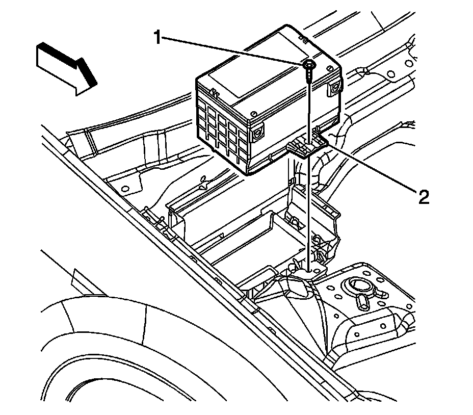 6. Remove the battery hold down retainer bolt (1) and retainer (2).