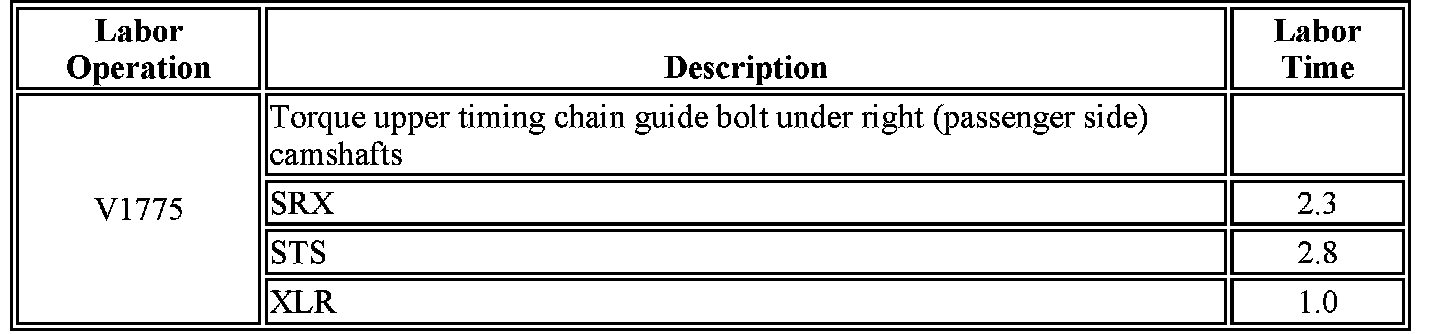 This bulletin provides a service procedure to torque the upper bolt that retains the timing chain guide under the right hand (passenger side) camshafts to specification on certain 2008 model year Cadillac SRX, STS, XLR, equipped with a 4.6L V8 (RPO LH2 - VIN A) engine.