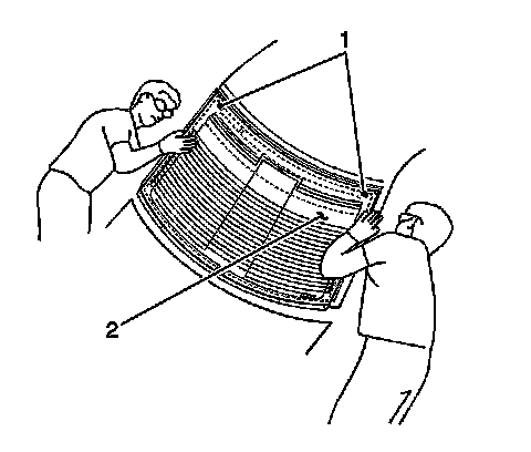 20. With the aid of an assistant, place the rear window into the opening while positioning the locator pins (1) to the body.