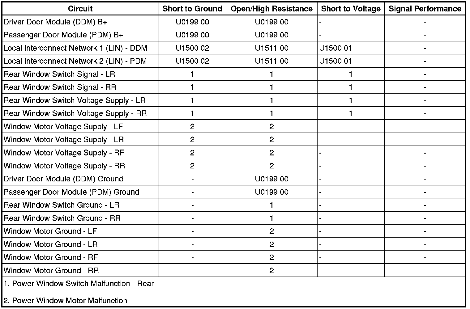 The DDM and PDM supply there respective rear power window switches with a B+ voltage reference and signal circuit. The rear power window switches contain separate resistors for each switch position. When a rear power window switch is activated, the associated door control module interprets the signal and checks for messages from other vehicle control modules prohibiting the window movement. If no prohibitive messages have been received, the door control module sends a LIN serial data message to the appropriate power window motor commanding the requested window position.