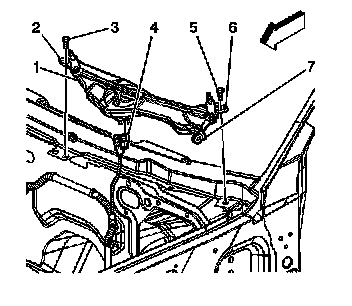 4. Align the wiper module locator hole (7) to the pin located inside rail of the driver side fender.