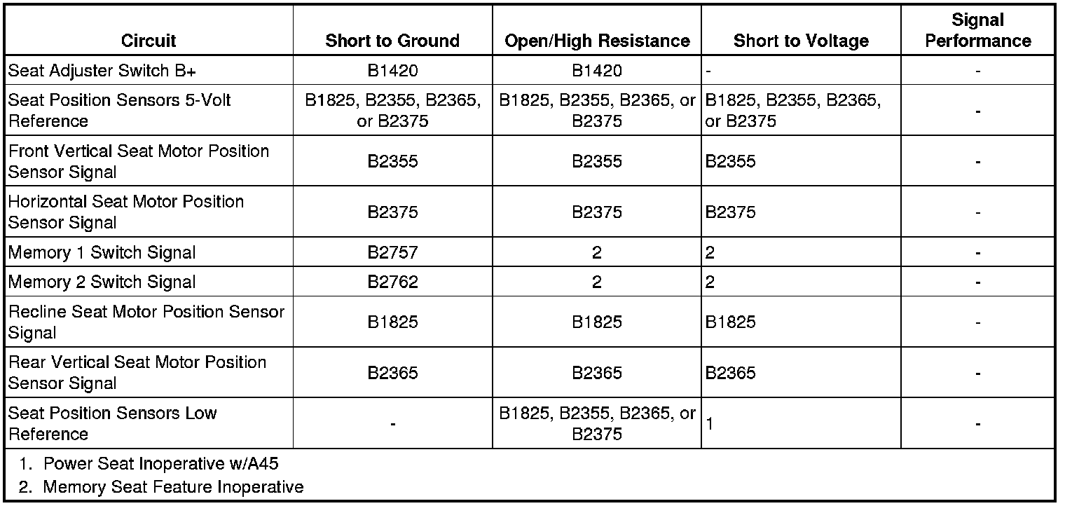The memory seat switches are normally open and are wired to the driver door switch assembly (DDSA). When a memory recall switch is pressed, the switch pulls the 5-volt signal circuit from the DDSA to ground. The DDSA senses that a memory recall signal was pulled low and a Class 2 serial data message is sent to the memory seat module (MSM) identifying the memory request. The MSM responds to the request by commanding the driver seat to move to the preset positions.