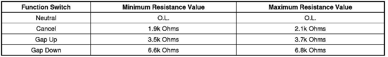 3. Measure the resistance between the supply voltage circuit terminal 1 and the signal circuit terminal 2. Individually activate and hold each gap function switch and compare the resistance reading to the values for the Gap Up, Gap Down, Cancel or the neutral position.