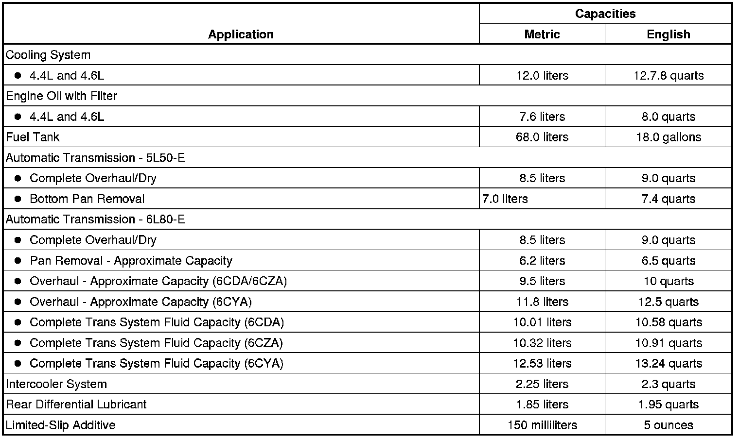 The following approximate capacities are given in English and metric conversions. See Fluid and Lubricant Recommendations (Service Intervals) for more information. All capacities are approximate. When adding, be sure to fill to the approximate level, as recommended in this manual. Recheck fluid level after filling.