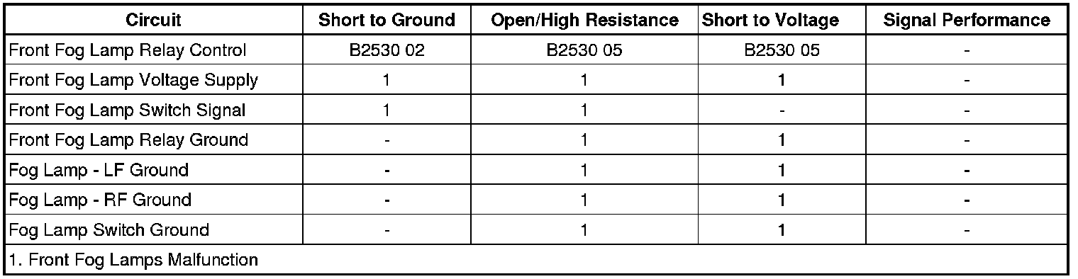* When DTC B2530 05 is present, the front fog lamps and/or the front fog lamp indicator will be ON at all times or will not operate.