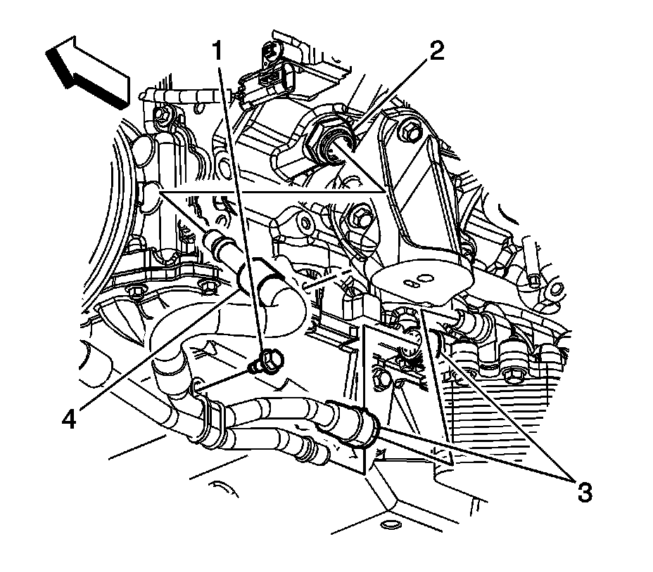 1. Apply a 3.175 mm (0.125 in) bead of sealant GM P/N 12346004 (Canadian P/N 10953480) to the threads of the engine oil cooler coolant fitting (2). Refer to Adhesives, Fluids, Lubricants, and Sealers (Specifications).