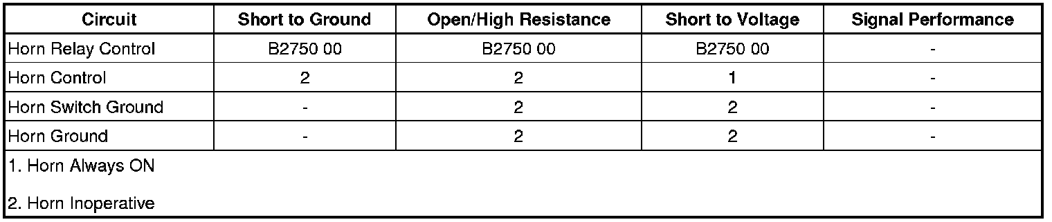 The BCM detects a short to ground, open, or short to voltage in the horn relay control circuit for approximately 125 milliseconds.