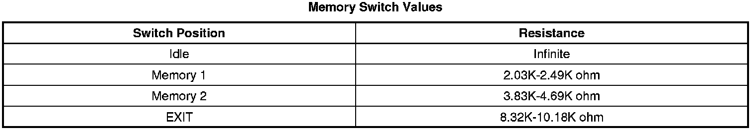 • If not the specified value, refer to the Memory Switch component test. If the switch tests normal, replace the driver door switch (DDS).