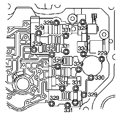 3. Install the upper control valve body bolts (229, 329, 330, 331) and hand tighten.