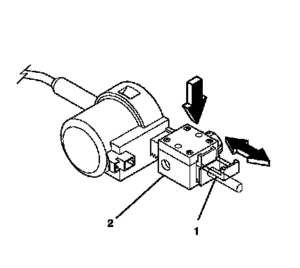 3. Press on the adjuster block (2) to compress the internal adjuster spring to disengage the adjuster teeth. Slide the adjuster block (2) as far away from the solenoid as possible.