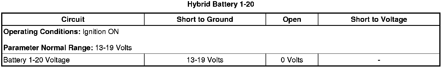 Ignition ON, observe the scan tool Hybrid Battery 1-20 parameters. Each reading should be between 13-19 Volts.