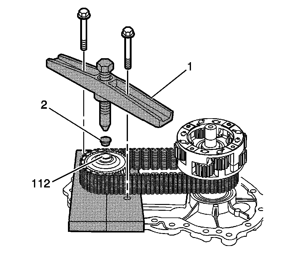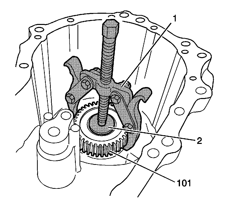 27. Using the J 22888-20A - puller (1) and the J 8107-2 - bearing puller (2), remove the rear sun gear (101) from the rear output shaft.